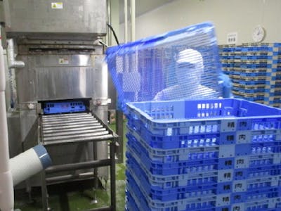 機械を使用して商品を入れるコンテナの洗浄・整頓など