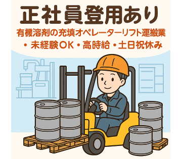 化学製品(有機溶剤)を扱う製造工場にて、製品のラベル貼りや充填オペレーター作業、出荷前準備などをお任せします。